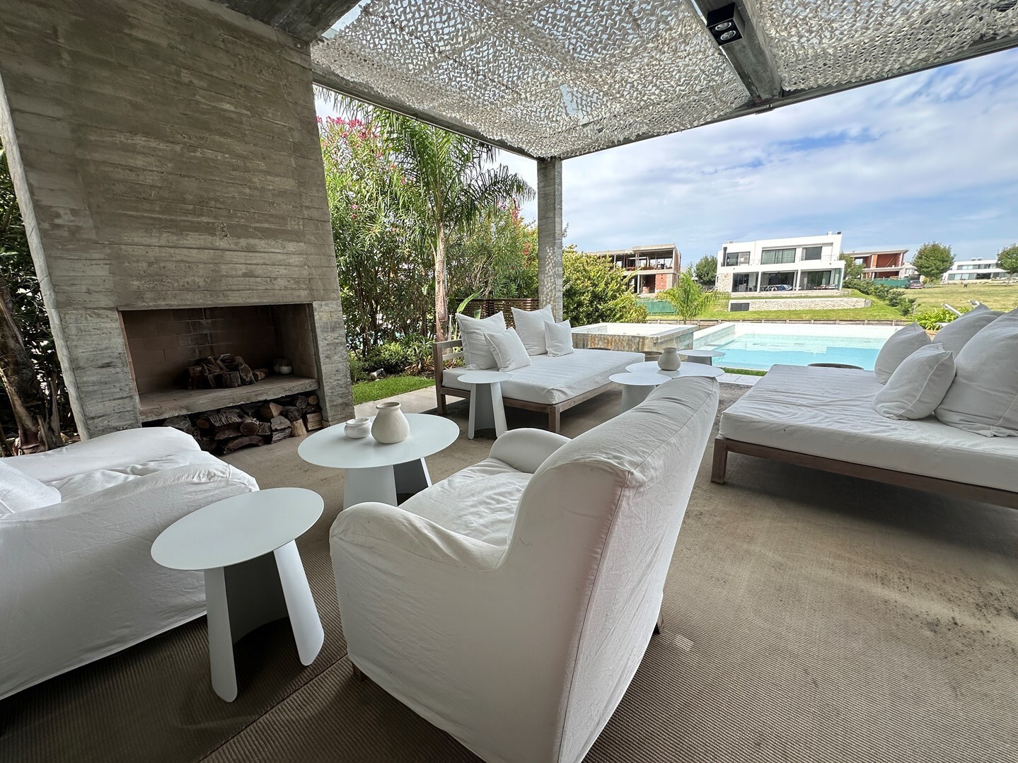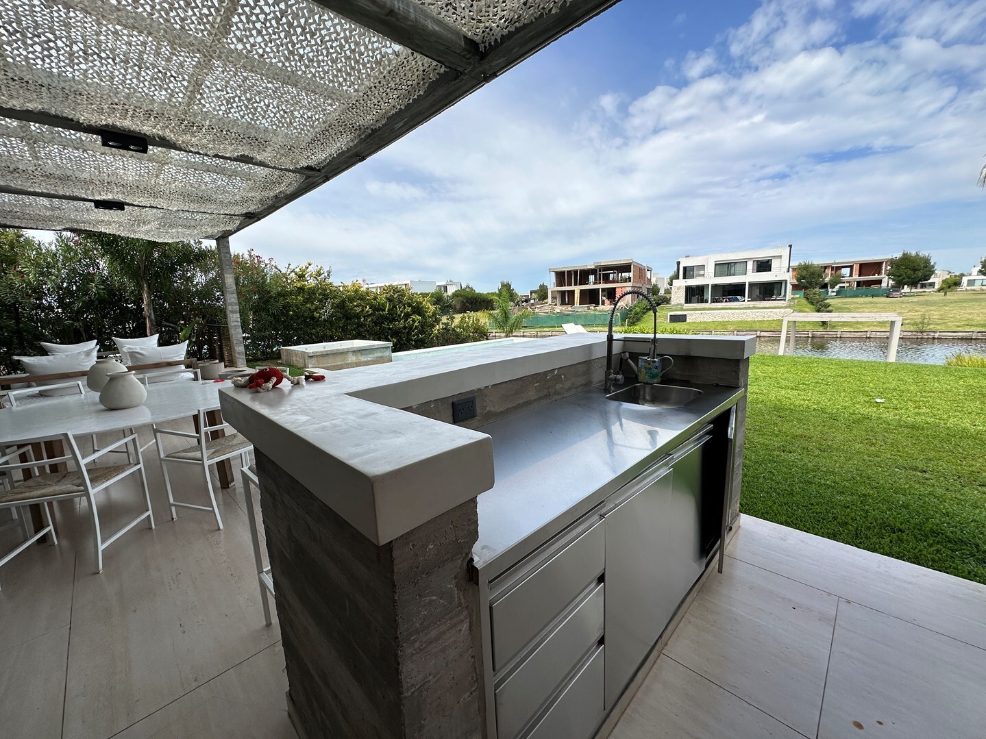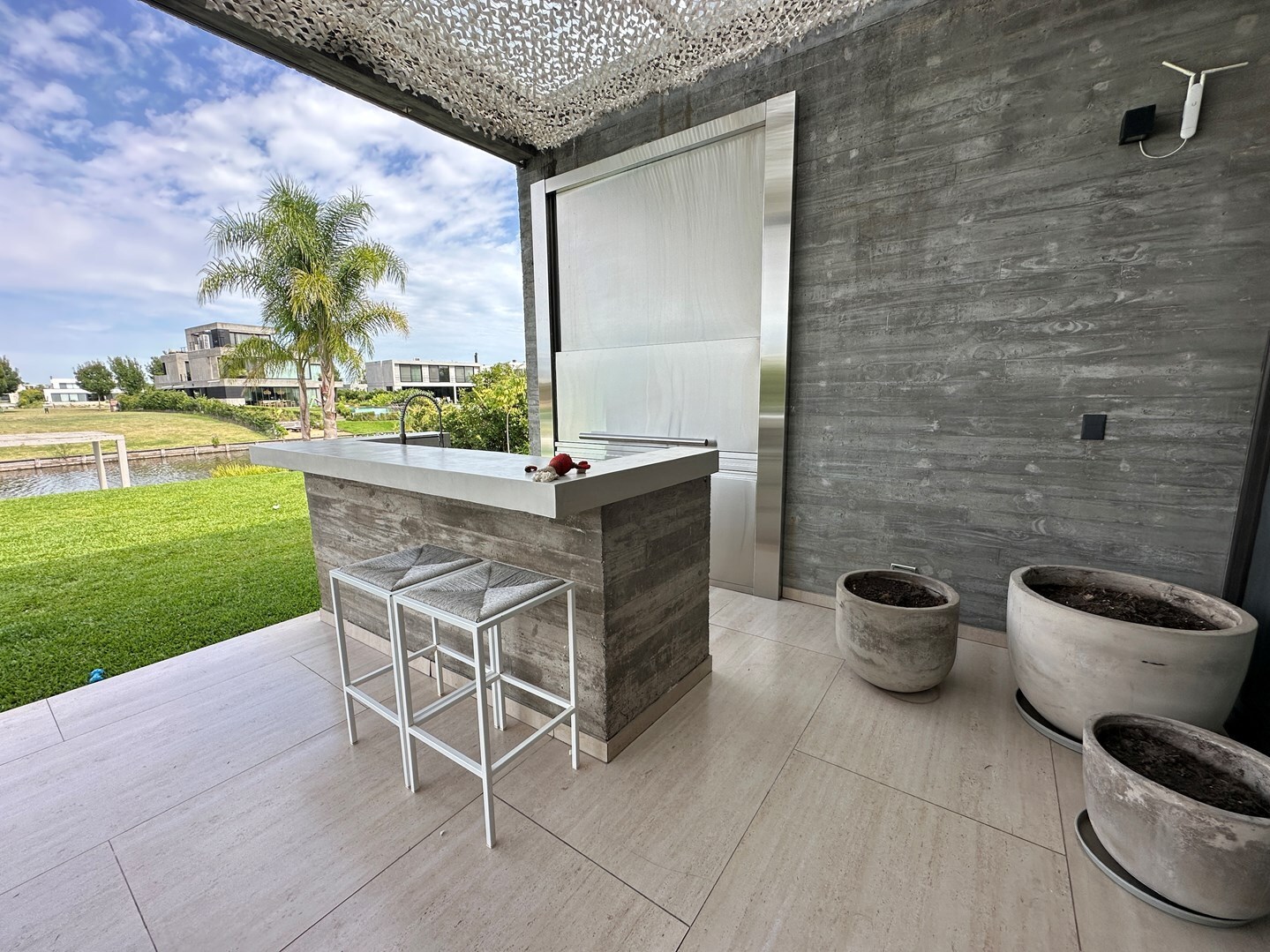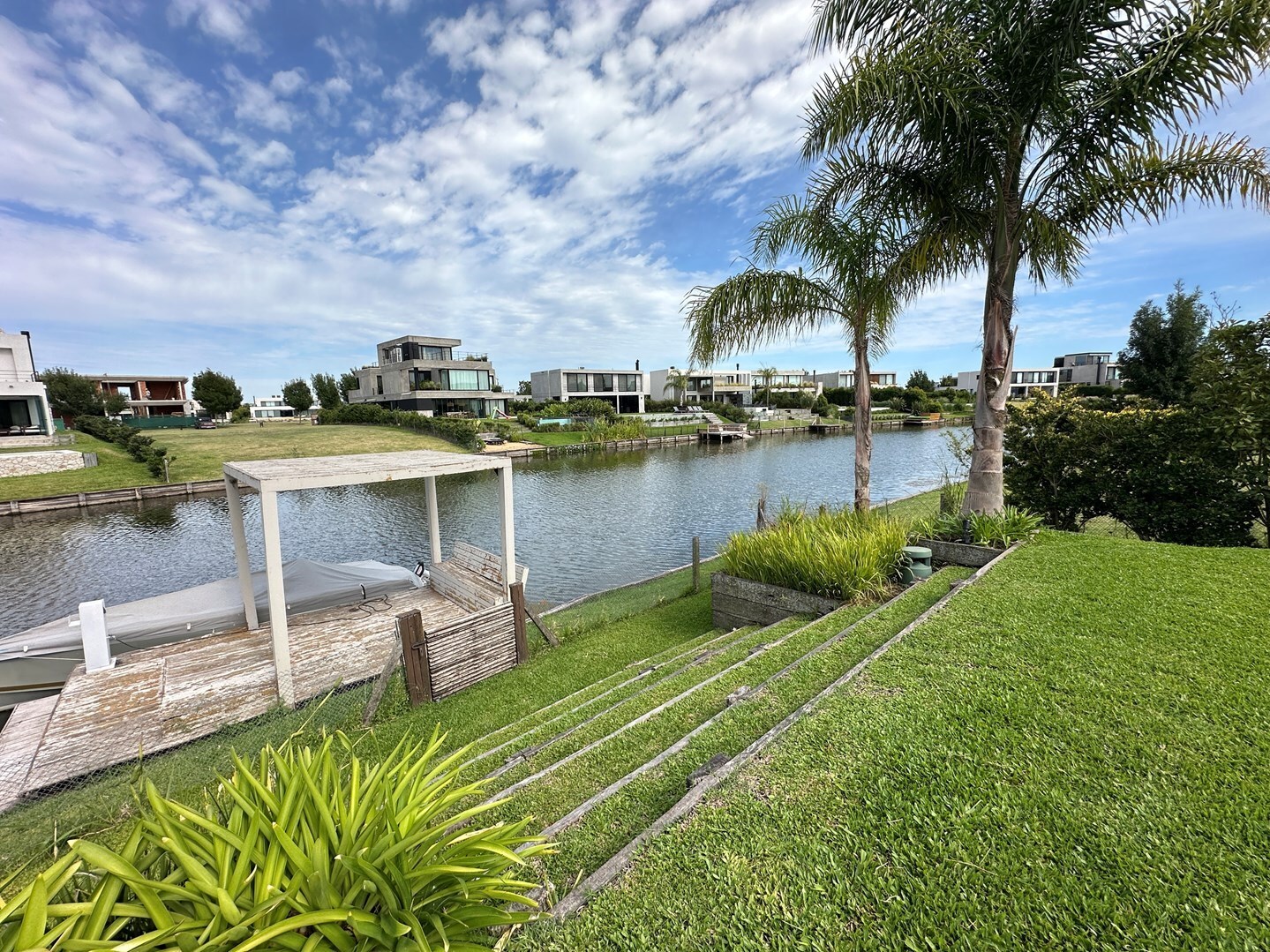 Espectacular casa moderna al lago en el barrio Virazón, Nordelta, con diseño contemporáneo y funcional. Se destaca por sus techos altos, grandes ventanales y excelente luminosidad, ofreciendo visuales abiertas y una fuerte conexión con el exterior. El ingreso se realiza a través de un portón de hierro y madera hacia un patio interno con estanque, que aporta privacidad y carácter. Desde el hall de entrada se accede al amplio living comedor principal con vista a la galería y al lago. En esta planta también se encuentra un playroom o family room, toilette y placard de recepción. La cocina, de generosas dimensiones, cuenta con isla central, espacio para dos heladeras dobles y sector de comedor diario o family, con salida directa a la galería. El área de servicio es independiente e incluye lavadero y dependencia de servicio completa. La galería es amplia y está equipada con hogar exterior, parrilla y barra con bacha, ideal para reuniones sociales. El jardín cuenta con pileta totalmente revestida en venecitas, jacuzzi exterior y acceso al muelle con salida directa al lago. En la planta alta se desarrolla la suite principal, con vestidor de gran tamaño y baño completo compartimentado. La casa dispone además de tres dormitorios adicionales, dos baños completos y un espacio de escritorio o playroom. Cuenta con cochera semicubierta para dos autos. Implantada sobre un lote de aproximadamente 1.000 m², con una superficie total construida cercana a los 500 m², esta propiedad se posiciona dentro del segmento premium del barrio. CMCPSI 7175 SK